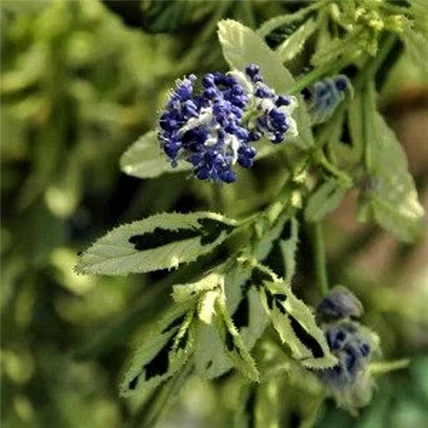 A Californian Lilac with unique cream and green variegated evergreen foliage, highlighted by clouds of mauve-blue flowers in late spring, a mecca for bees, butterflies and other pollinators. Smaller and more compact than other varieties. It provides a terrific backdrop on a sunny, sheltered border. Protect from long periods of very cold weather. Height 120cm spread 90cm.